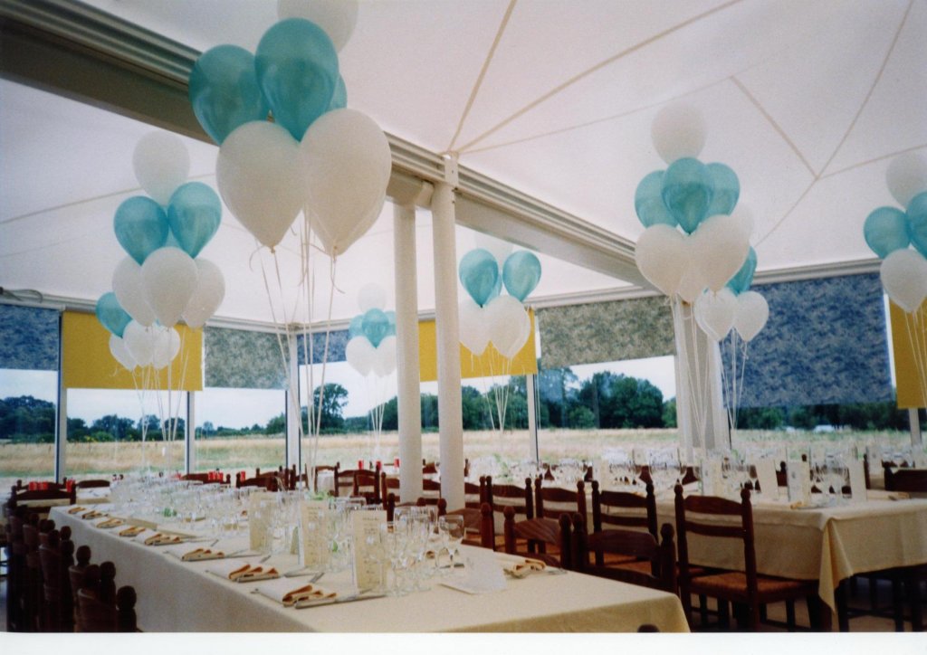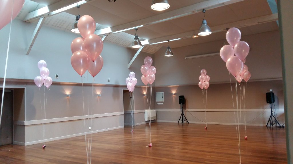 Les ballons peuvent répondre facilement à cette contrainte : "Ballons géants" (ci dessus) ou "bouquets hauts" de 5 ballons (ci dessous), offrent de nouvelles perspectives qui permettront de donner une touche personnelle et aérienne à votre réception.