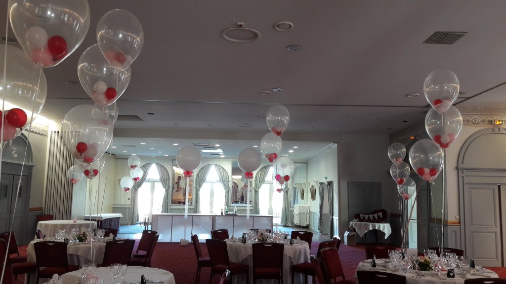 Un décor composé de ballons transparents (diam 40 cm) dans lesquels ont été glissés par nos soins des petits ballons de 10 cm de diamètre.