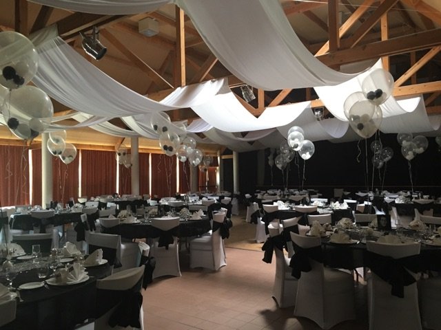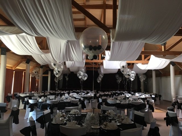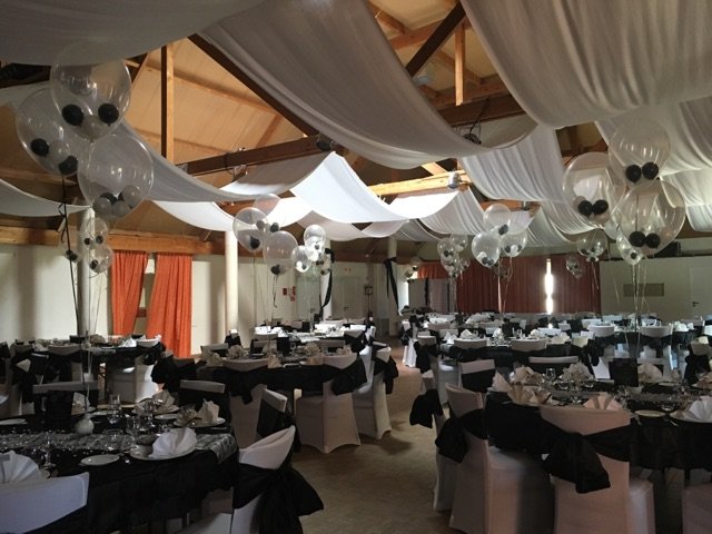 Le coloris de la réception était basé sur le noir et blanc. C'est tout naturellement qu'a été proposé un décor réalisé avec des ballons transparents dans lesquels ont été glissés des petits ballons... noirs et blancs. Un ruban blanc permettait de relier les ballons à la table et au lest.