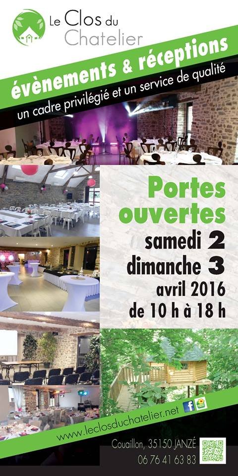 Vous pourrez nous rencontrer durant tout le week end des 2 et 3 avril prochain aux portes ouvertes du Clos du Chatelier. L'occasion pour vous de découvrir des photos, d'échanger et d'obtenir facilement et grattement un devis pour votre réception familiale. C'est Clémentine qui vous accueillera durant ces 2 jours. Elle saura répondre à toutes vos questions.