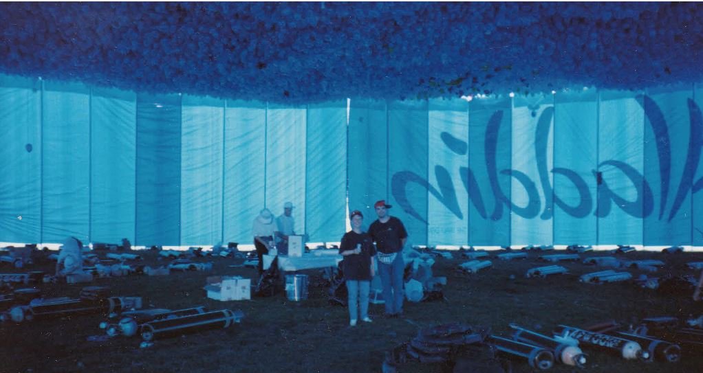Tout naturellement, avec l'agence, le client est arrivé à la conclusion que seul un lâcher gigantesque de ballons pourrait interesser les médias et par conséquent les familles et par conséquent faire savoir aux familles que la nouvelle "k7 video" (et oui !, c'etait en 1994...) d'Alladin sortait ce jour là dans les magasins