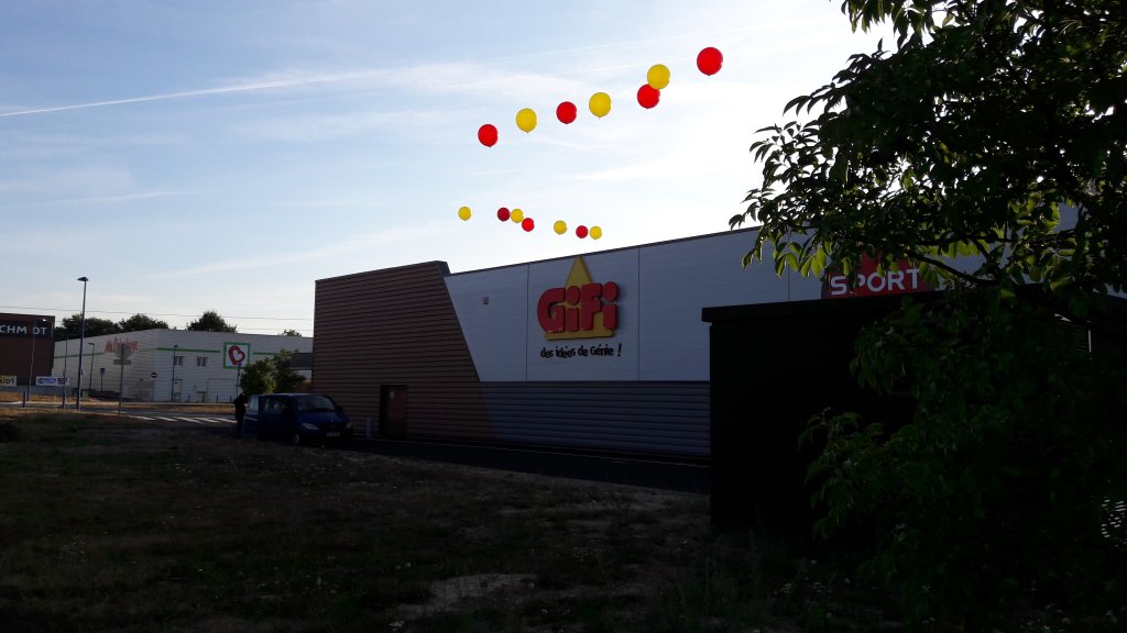 Ci dessous une très courte vidéo vue du toit du magasin GIFFY pour qui nous avons installé les ballons. Ces images vous donneront un aperçu de la visibilité exceptionnelle offerte par ces ballons géants (1 m de diam) biodégradables